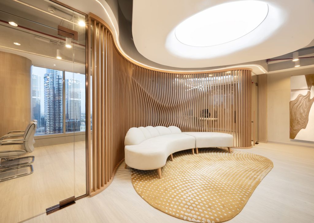 In contrast, the lighting in the Dune Project in Dubai is to bring the outside in. A corporate office situated in a concrete jungle, the office has been designed to be a space of calm. Hence, muted tones, textural elements, and an artifical skylight helps establish a sense of connection to nature, and therefore, to ourselves.