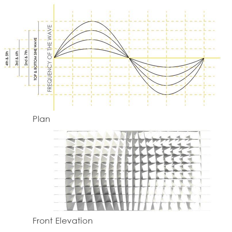 A façade design turned into an architectural sculpture for an exhibition. In the studio, we explore various forms that are self-organizing and self-supporting. This algorithm not only has a self-supporting design but also has a skin that is actuated based on the incident sun rays on the facade. It was ultimately a pavilion where the form was completely data driven. The form itself is derived with the help of sine curves to be a self standing structure.