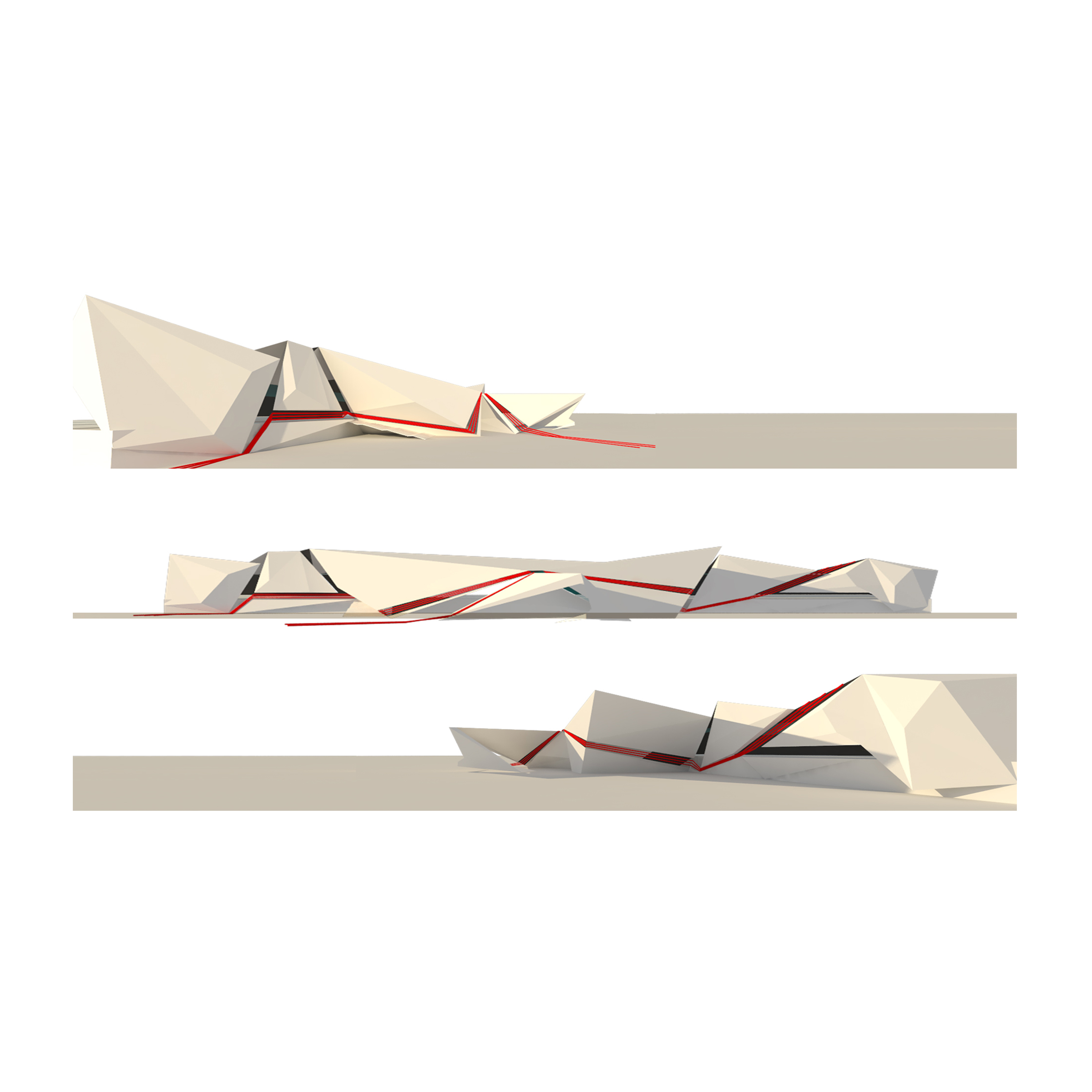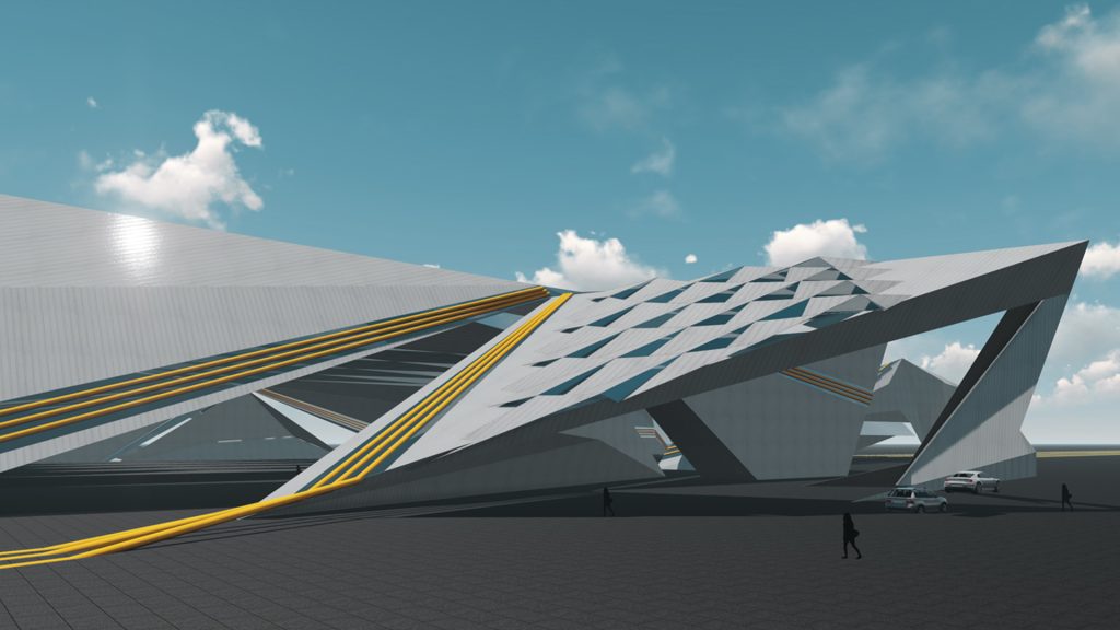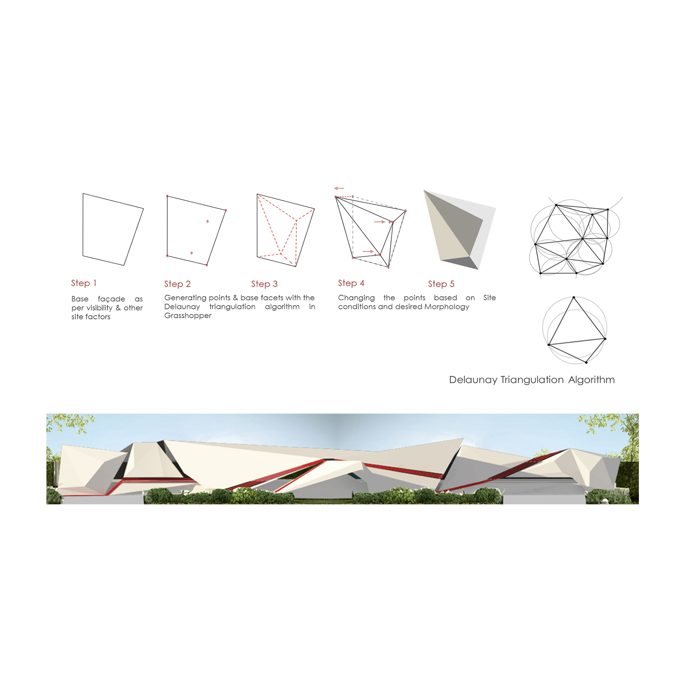 The geometric principle of Delaunay’s Triangulation is used in the façade design to optimize the light filtration. The Roof is an origami inspired structure which allows the soft northern light and terminates the heat from the west during the day. The entire roof is made of steel members and cladded with glass and fiber cement board composite panels.